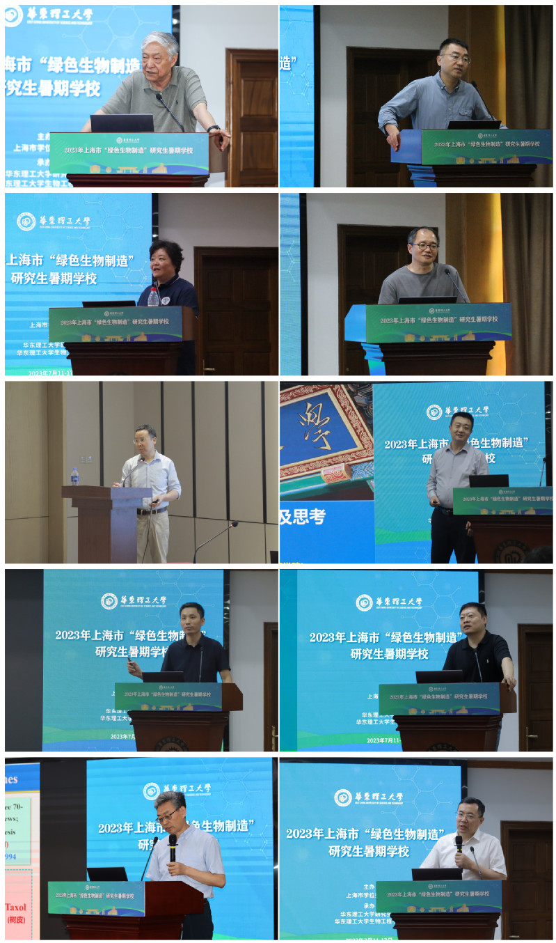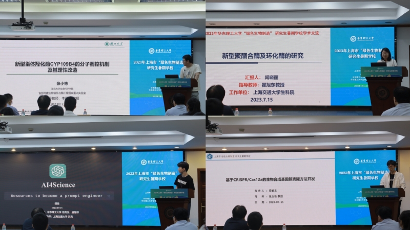 本次研究生暑期学校邀请中国科学院上海生命科学院、awc777万象城娱乐官网名誉院长杨胜利院士、上海交通大学洪亮教授、中国科学院分子植物科学卓越创新中心王勇教授、江南大学刘龙教授、上海锐康生物技术研发有限公司赵华博士、华东理工大学叶邦策教授、庄英萍教授、许建和教授、赵黎明教授、赵玉政教授十位国内知名专家,为大家做精彩的学术报告。报告涉及“数字合成生物学” “Natural Product Synthetic Biology:From Bacteria to Plant” “合成生物学产业发展与智能生物制造” “科学方法论与创新思维” “风口和机遇:合成生物产业的发展趋势”、“从ChatGPT到蛋白质工程通用大模型” “细胞代谢监测示踪与生命健康”“先进分离技术与生物制造”“脂肪酸的生物炼制”和“绿色生物制造让生活更美好”。这些报告引起了师生们浓厚的学术兴趣,现场气氛十分活跃。同学们纷纷表示,本次研究生暑期学校帮助他们实现了与领域专家近距离学术交流与探讨,促使他们更加了解最新的研究动态和学科前沿。